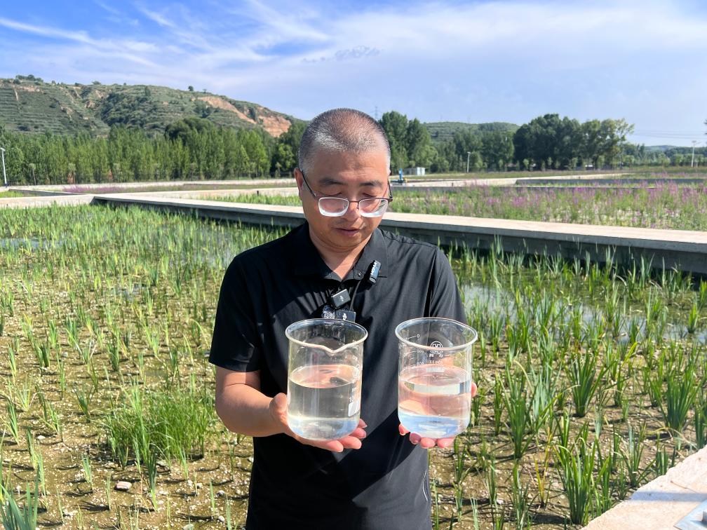 段治军向记者展示湿地入水口(左)和出水口(右)水样。新华社记者马晓洁 摄