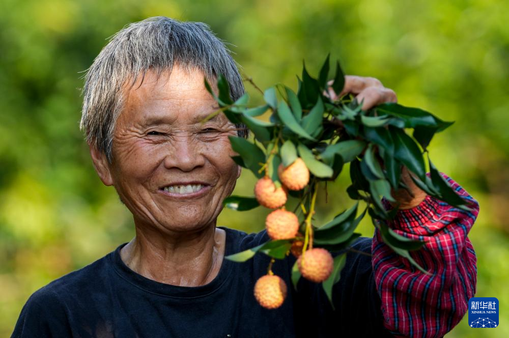 7月29日,重庆市涪陵区南沱镇睦和村村民在荔枝园内采摘新鲜的荔枝。