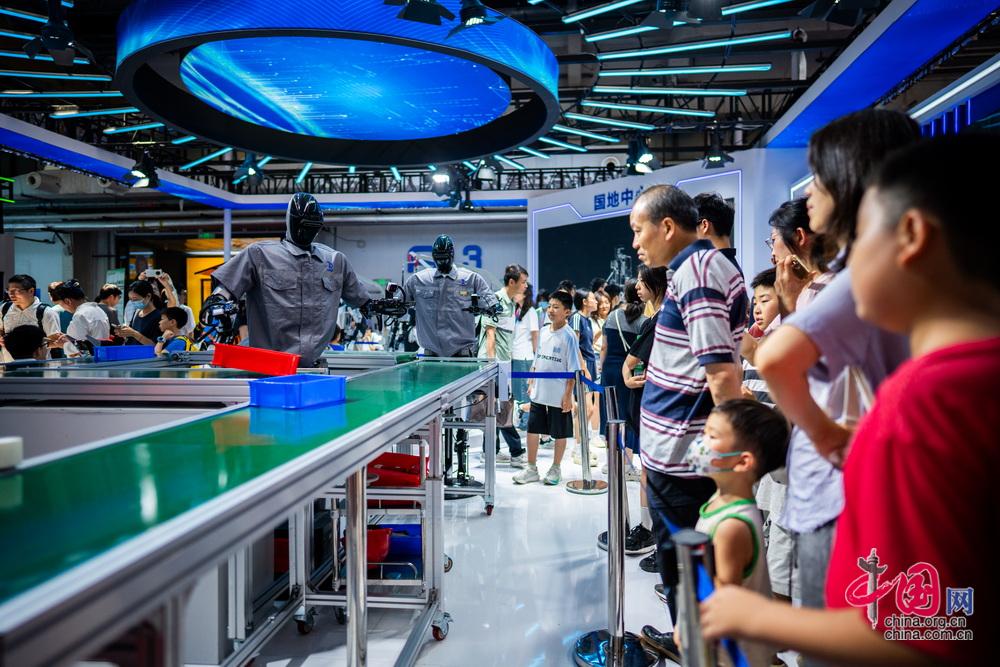 观众在现场围观一款应用于流水线生产的智能机器人。 中国网记者 郑亮摄