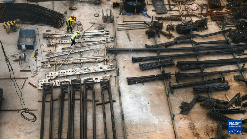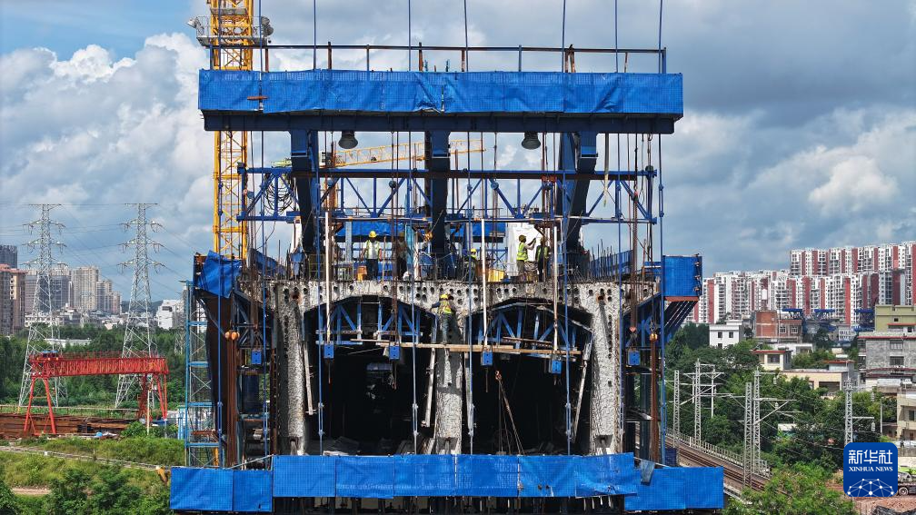 工人在位于广西钦州的钦北线铁路桥新桥工地施工(8月28日摄)。