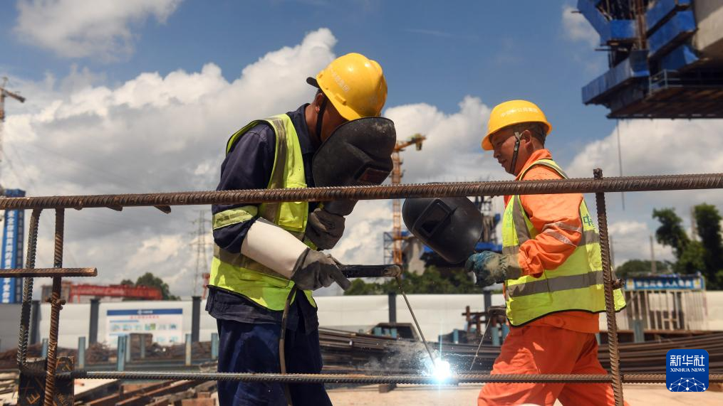 在钦北线铁路桥新桥工地,工人在进行焊接作业(8月27日摄)。
