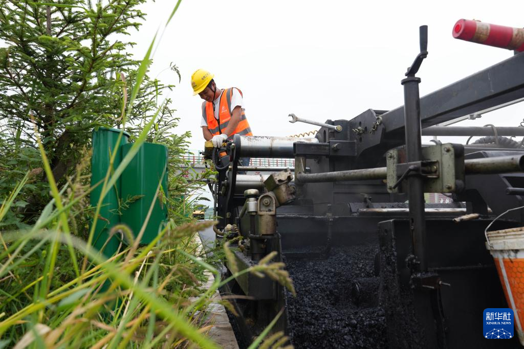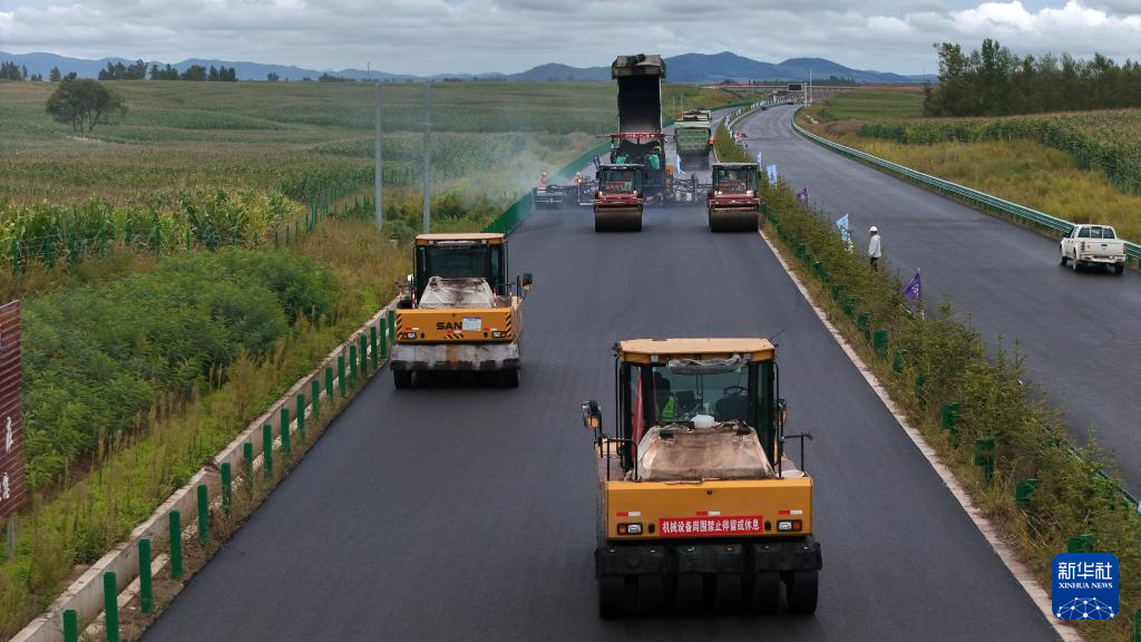 8月28日,在铁科高速公路延寿县至尚志界段主线,工作人员操作机械设备进行沥青摊铺收尾作业。