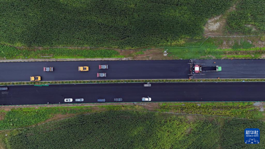 8月28日,在铁科高速公路延寿县至尚志界段主线,大型机械设备在进行沥青摊铺收尾作业(无人机照片)。
