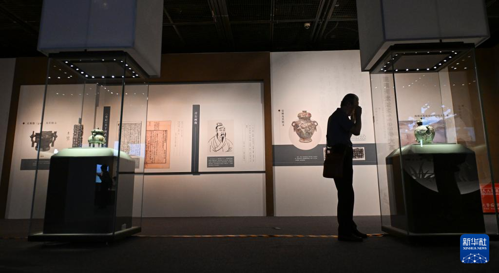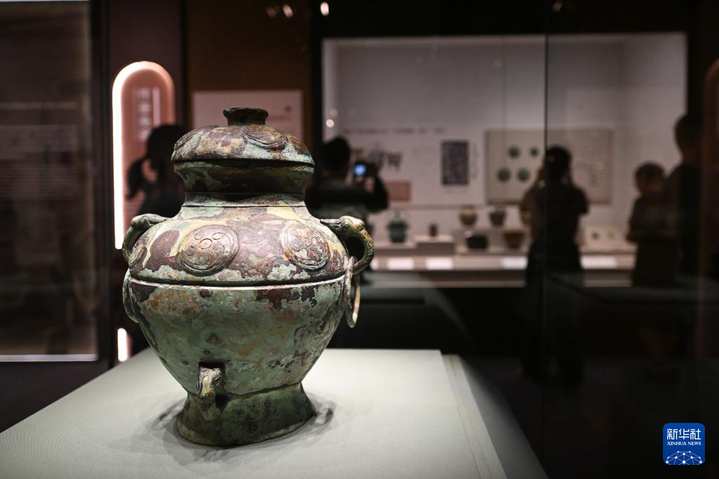 琉璃河遗址出土文物克盉(左)、克罍在展览中同时展出(8月28日摄)。