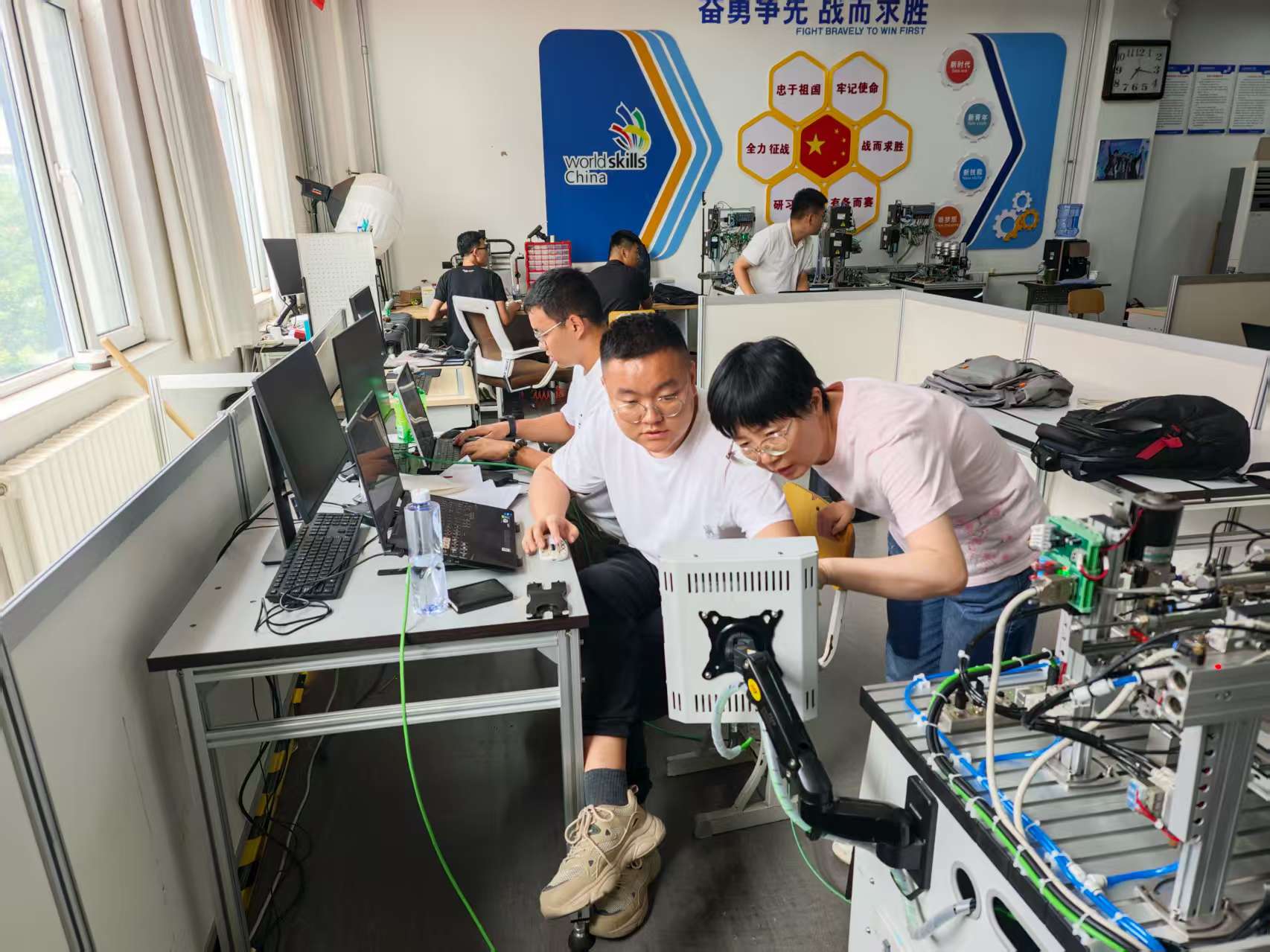 工业4.0项目选手刘杰,赵嘉乐,及教练王薇老师,正在进行实操训练,每天训练在10个小时以上