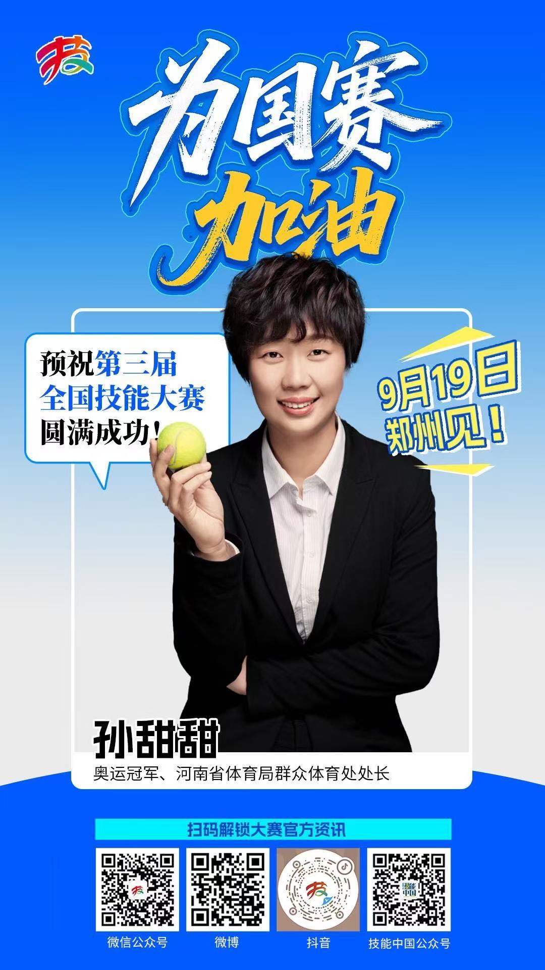 #技能照亮前程#【为国赛加油】奥运冠军、河南省体育局群众体育处处长孙甜甜:预祝第三届全国技能大赛圆满成功!中华人民共和国第三届职业技能大赛是经国务院批准、人力资源社会保障部主办的综合性国家职业技能赛事,是中国技能人才竞技的最高舞台,是培养选拔高素质技能人才的重要途径,是世界技能大赛国家队的选拔赛场。#第三届全国技能大赛#