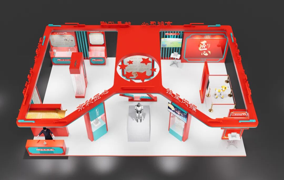 整体设计以“中国红”与“松石蓝”撞色搭配为主调,既彰显中华文化的庄重热烈,又体现科技未来的冷静睿智。两种色彩在空间中有机交融,形成强烈的视觉张力。展位采用四面开放的布局,运用格栅和展柜将互动展演和静态展示空间自然分割,营造通透流畅的观展体验。面向主通道的中心展区,以“天工”智能机器人作为视觉焦点,象征现代高精尖技术的卓越成就;其两侧对称设置传统工艺展柜,陈列花丝镶嵌、景泰蓝等非遗精品,匠心与科技的时空碰撞,突出了“传统与现代对话”的策展理念。