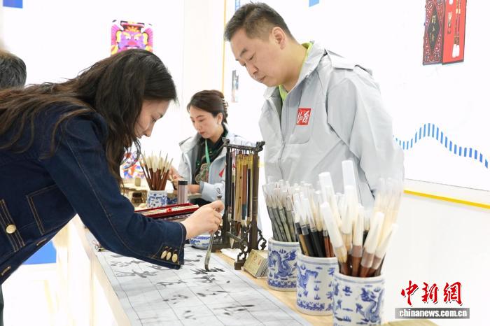 9月19日,河南省郑州市中原国际会展中心,山西省级非物质文化遗产代表性项目绛笔制作技艺展示区,民众体验用新绛毛笔写书法。 解凯光 摄