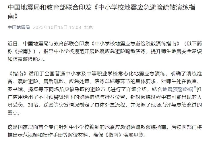 这是国家层面首个专门针对中小学校编制的地震应急避险疏散演练指南。后续两部门将推出示范视频和操作手册等解读材料,确保《指南》落地见效。