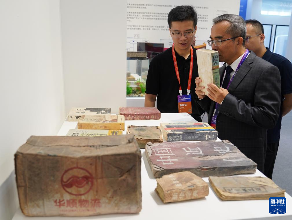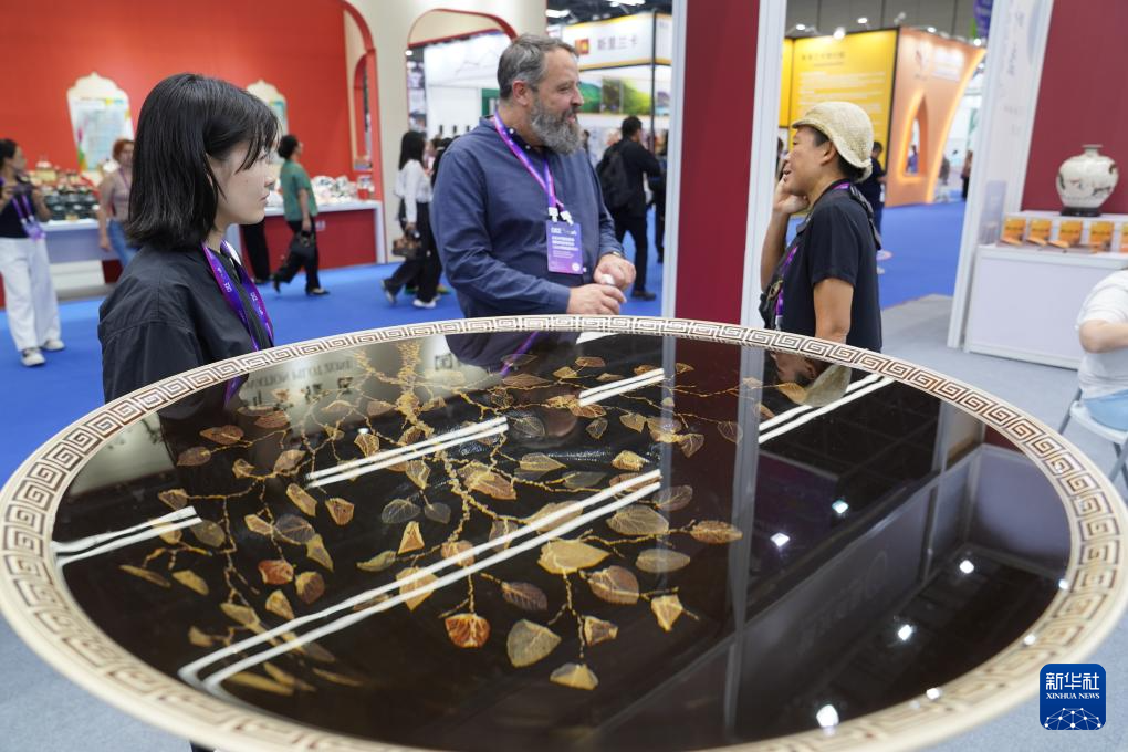 10月18日,参观者在陶瓷博览会展区观看制成纸质书籍等样式的陶瓷制品。