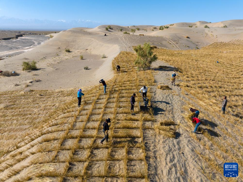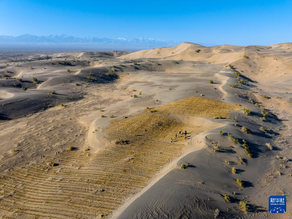 10月18日,施工人员在库姆塔格沙漠“锁边工程”项目建设现场铺设沙障(无人机照片)。
