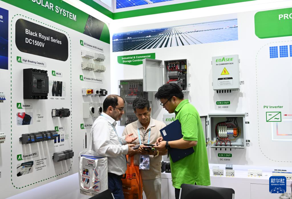 10月19日,客商与展商在第138届广交会展馆日月元科技(深圳)有限公司展台交谈。