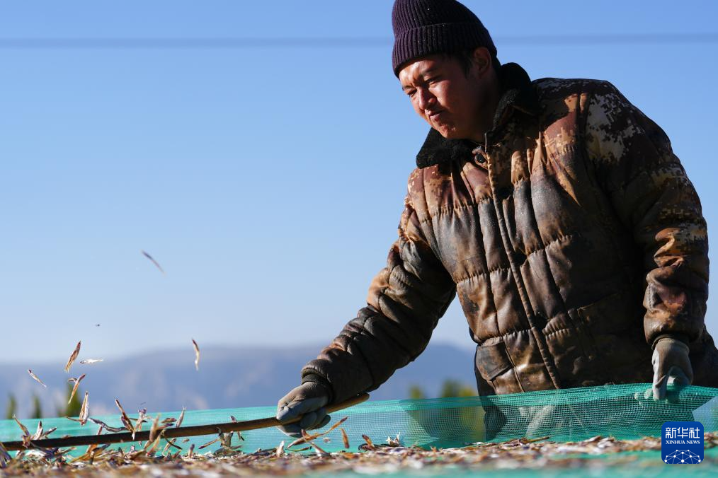 10月18日,在青海省海南藏族自治州共和县龙羊新村龙羊峡海湖渔业捕捞合作社,一名工人将晒好的小银鱼抖散,以防在后续加工中出现粘连。