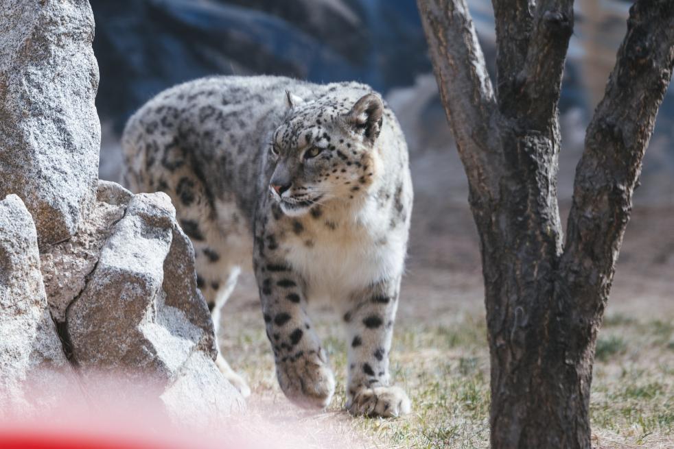 2025年4月1日,中国现存最年长的人工繁育雪豹“傲雪”在西宁野生动物园雪豹馆内散步。新华社发(西宁野生动物园供图)