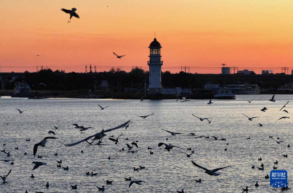 10月21日,候鸟在松花江哈尔滨段上空飞翔。