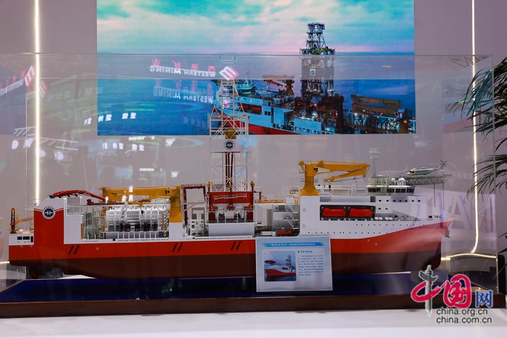 10月23日,2025(第二十七届)中国国际矿业大会在天津开幕,图为自然资源部展台展出的“梦想”号钻采船模型,“梦想”号钻采船长179.8米,宽32.8米,排水量42600吨,续航力15000海里,自持力120天,具备全海域全天候作业能力,最大钻深11000米,是全球钻探能力最强、科研实验功能最全、智能化水平最高、综合运维成本最低的超深水钻探科考船,有望率先实现“打穿地壳、进入地球深部”科学梦想。中国网记者 董宁 摄影