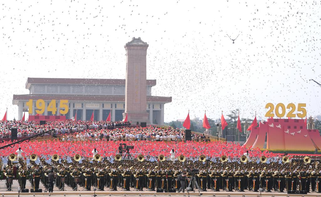 9月3日,纪念中国人民抗日战争暨世界反法西斯战争胜利80周年大会在北京隆重举行。这是纪念大会现场放飞鸽子。新华社记者 陈晔华 摄