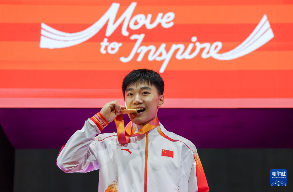 10月24日,冠军洪延明在颁奖仪式上咬金牌庆祝。新华社记者 白雪飞 摄