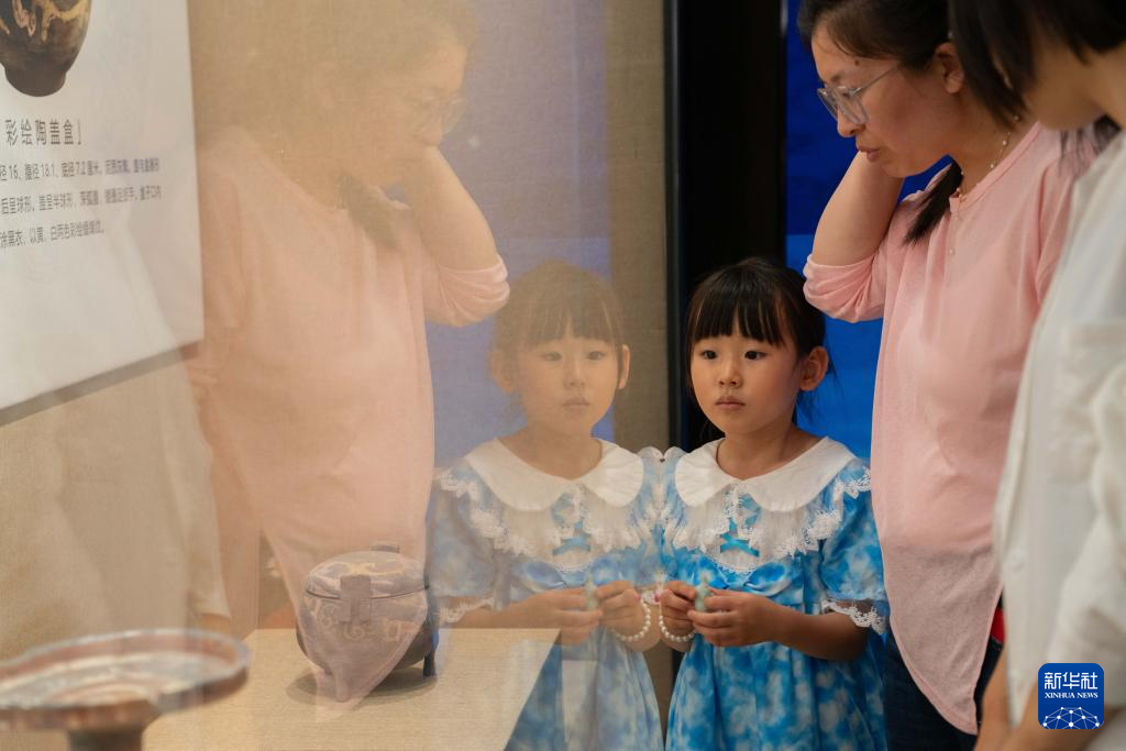 7月3日,在内蒙古呼和浩特市和林格尔县盛乐博物馆,游客们观赏土城子遗址中出土的文物。新华社记者 马金瑞 摄