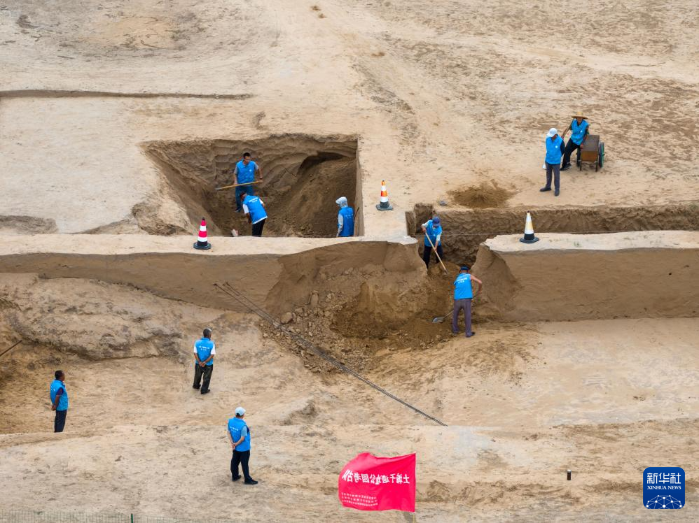 7月4日,在内蒙古呼和浩特市和林格尔县,考古队工作人员对土城子古城遗址北城西门进行考古发掘(无人机照片)。新华社记者 马金瑞 摄