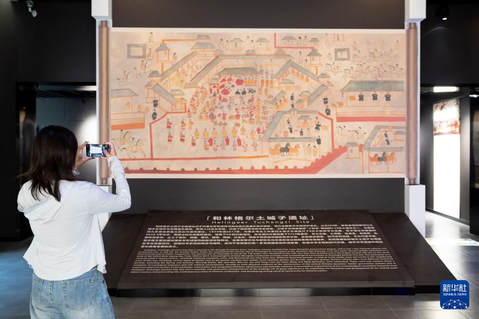 7月3日,在内蒙古呼和浩特市和林格尔县盛乐博物馆,游客在和林格尔土城子遗址简介前参观拍照。新华社记者 马金瑞 摄
