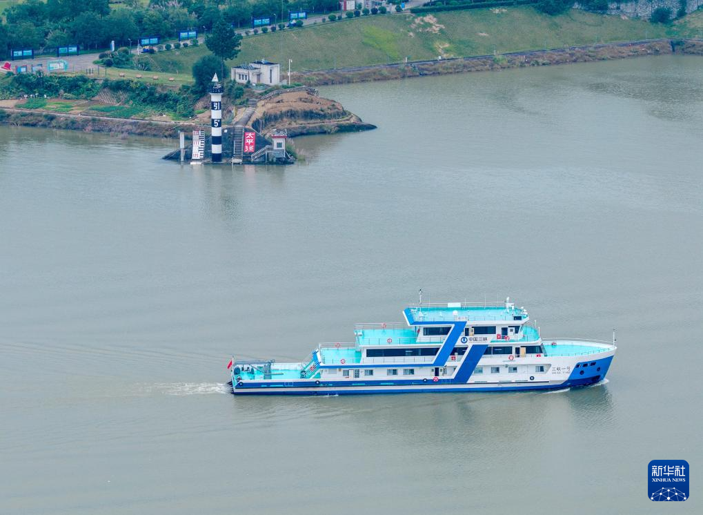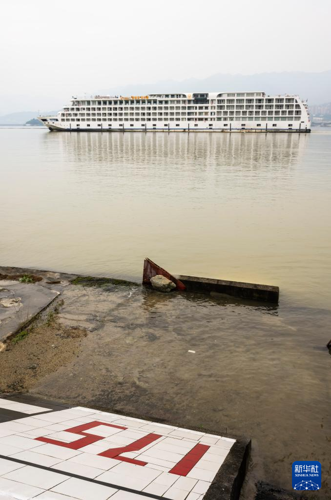 10月24日,船舶从三峡大坝上游湖北省宜昌市太平溪水文标尺前驶过(无人机照片)。