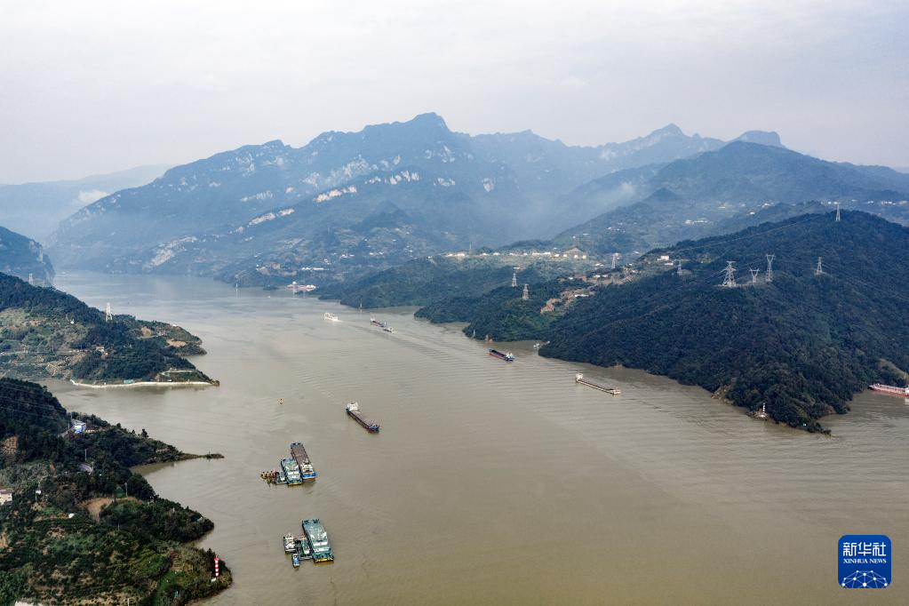 10月24日,船舶行驶在三峡大坝上游的湖北省宜昌市秭归县水域(无人机照片)。