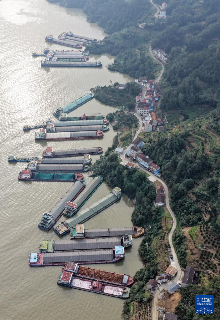 10月24日,船舶停靠在三峡大坝上游的湖北省宜昌市秭归县水域等待过闸(无人机照片)。
