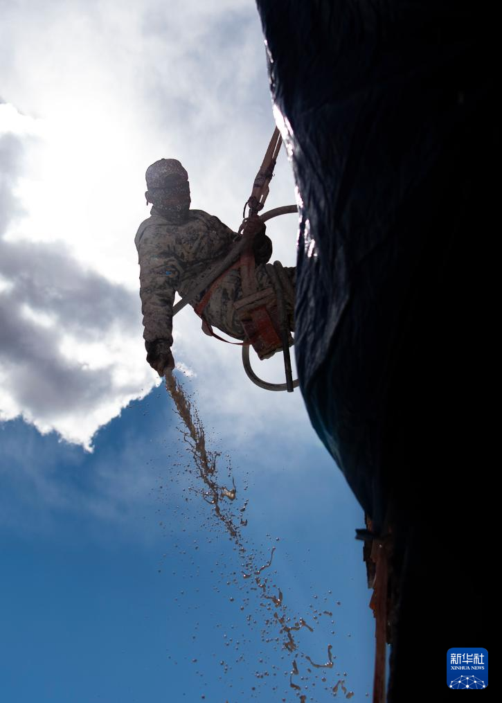 近日,西藏布达拉宫迎来一年一度的粉刷“美容”。工作人员和志愿者将粉刷材料按比例混合,经过滤后对布达拉宫墙体进行喷涂,让建筑更加美观。