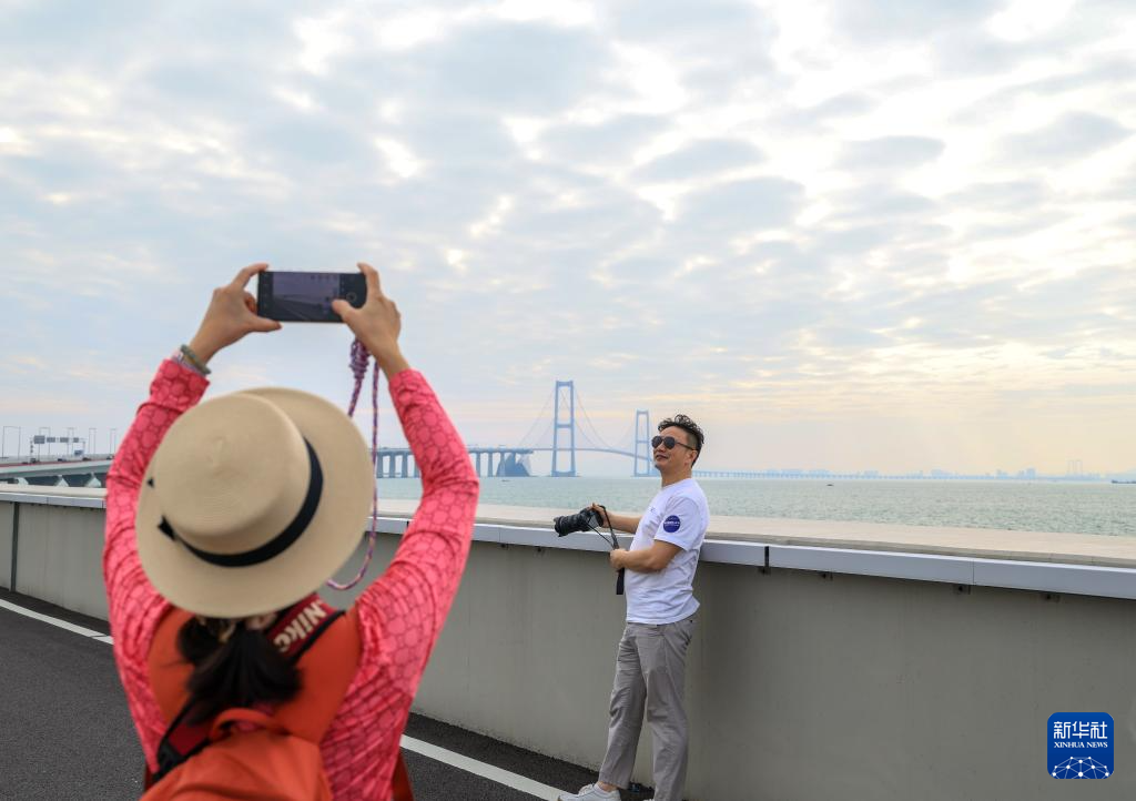 10月25日,游客在深中通道西人工岛上留影。