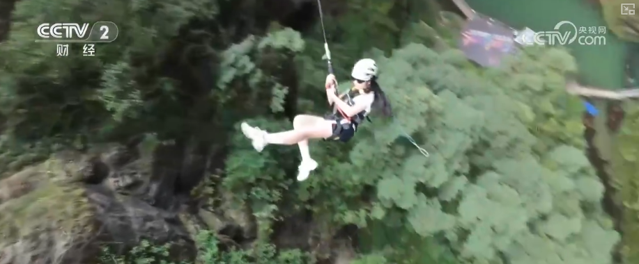 这里是一处典型的岩溶漏斗,直径约300米、坑深约280米。依托独特的地质奇观,当地开发出了蹦极、大秋千、探洞等多种极限运动。随着蹦极者一跃而下,穿梭机紧随其后,俯冲、旋转、仰角、贴地飞行,每一帧都像动作大片。