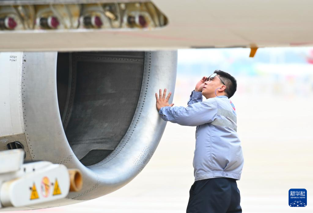 10月26日,在福州长乐国际机场,工作人员在检查飞机安全情况。