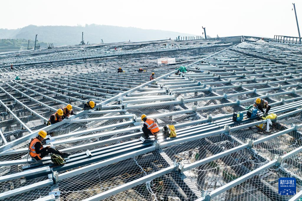 10月27日,施工人员在西安东站站房钢结构顶部进行施工作业(无人机照片)。