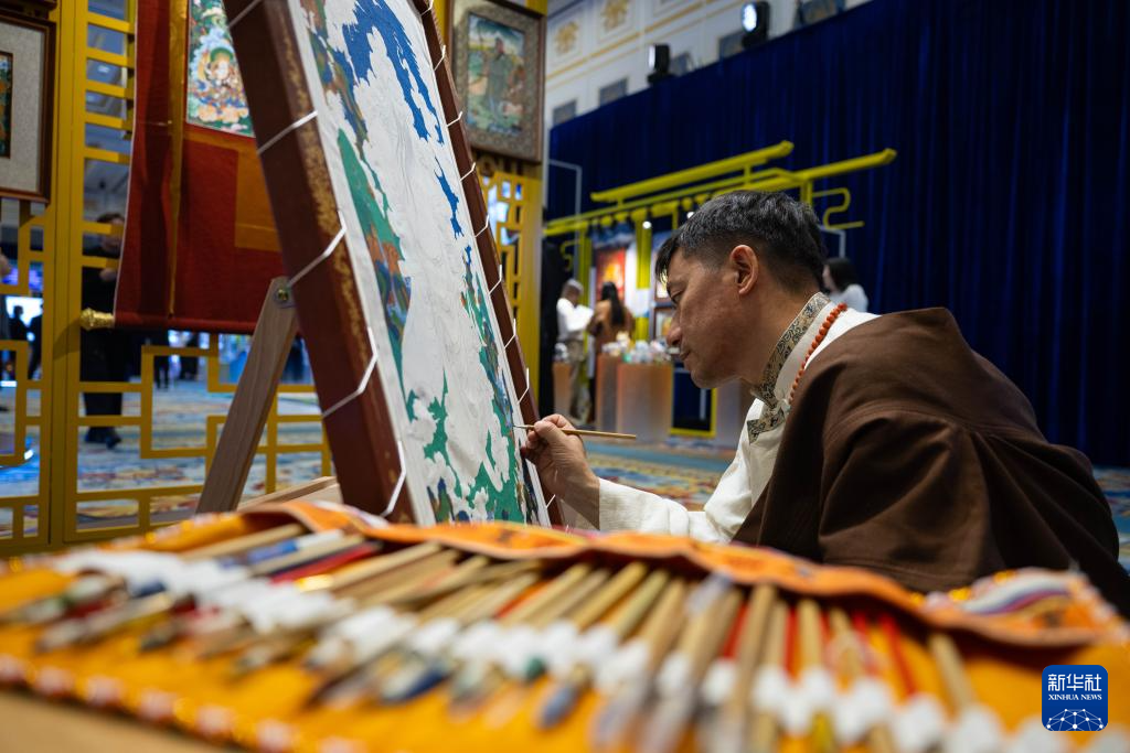 10月28日,手工艺人在“大美青海”专场推介会上展示唐卡创作。