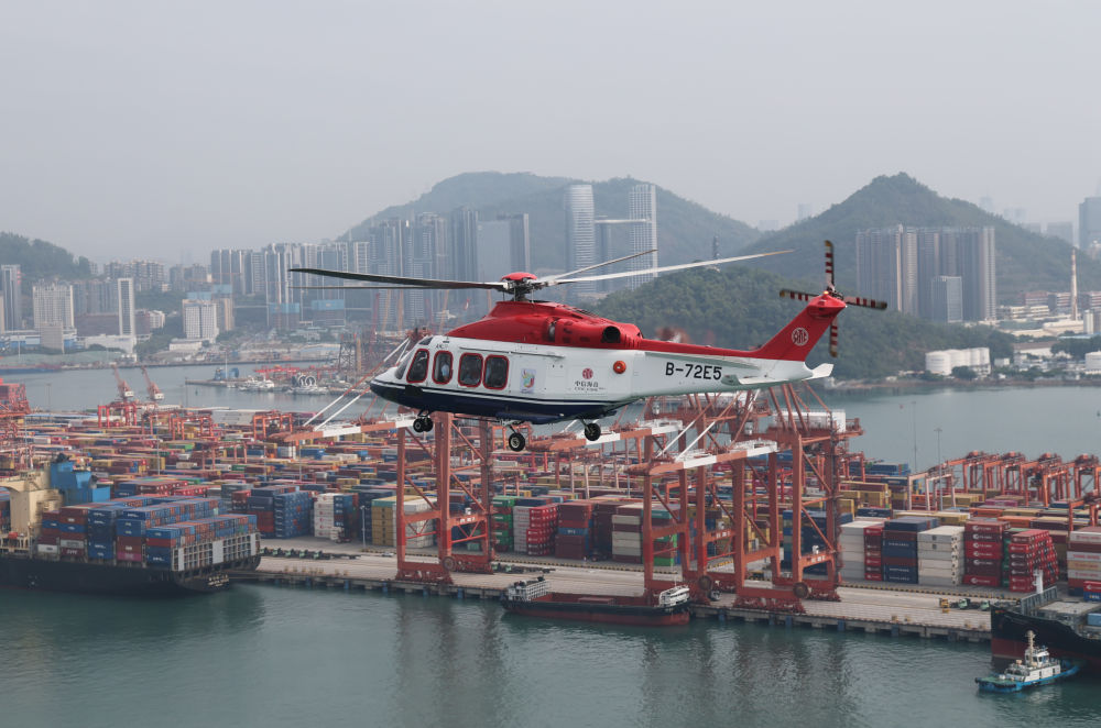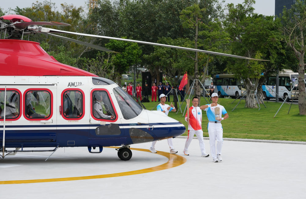 ↑ 搭载圣火的直升机进行空中传递。新华社记者 梁旭 摄