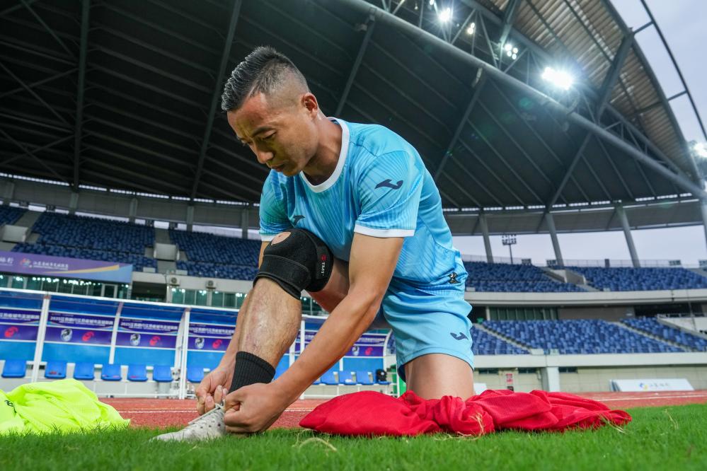 6月23日,戴虎在淮安奥体中心体育场内穿球鞋,准备和队友们一起参加训练。作为“苏超”淮安队的一员,39岁的戴虎在绿茵场上司职边后卫,而他的另一重身份,是淮安市涟水县韩陈村党支部书记。作为基层干部,他计划将足球的激情与活力带回村里,引导青少年养成健康的生活方式。他希望,在“苏超”联赛的影响下,更多的孩子可以接触足球、参加户外运动,培养团队意识。新华社记者 李博 摄