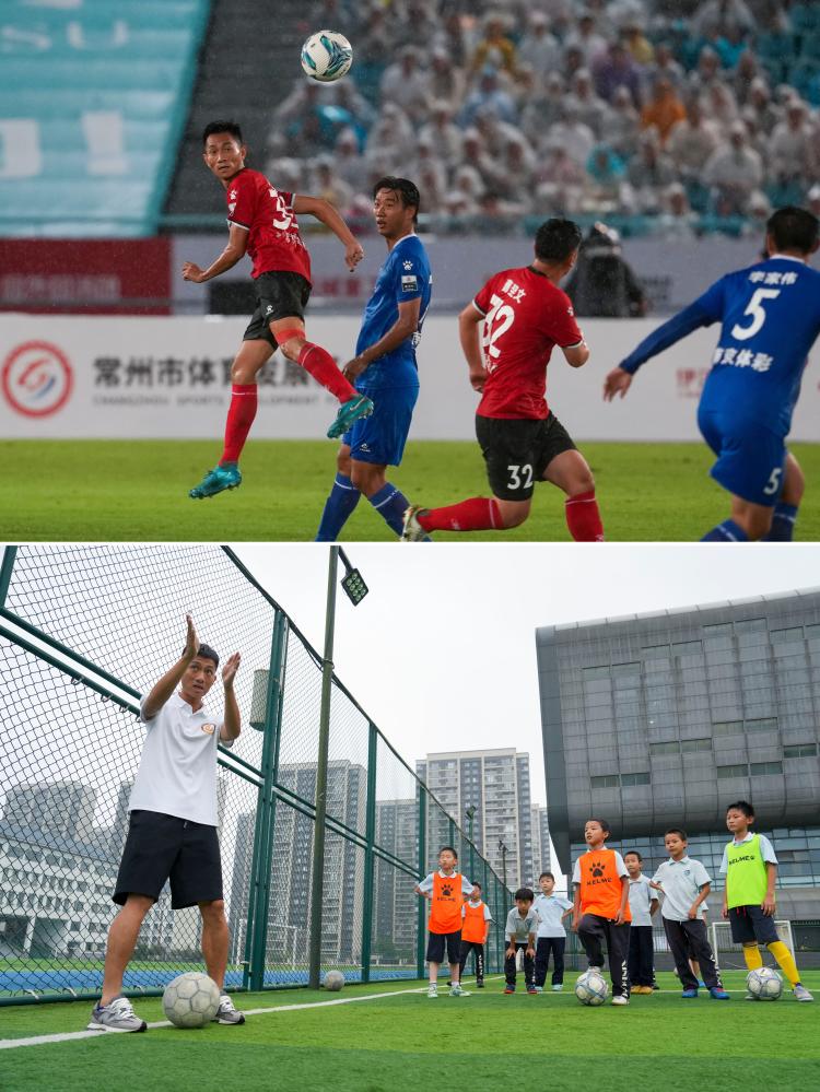 上图为2025年6月21日,常州队球员卢志勇(左一)在“苏超”第五轮对阵南京队的比赛中;下图为2025年6月22日,常州市钟楼区昕弘实验学校的体育老师卢志勇指导校队球员进行训练。今年32岁的卢志勇少年时接受足球系统训练,曾效力于常州一支业余足球队,大学毕业后来到常州市钟楼区昕弘实验学校担任体育老师兼校足球队教练。新华社记者 李博 摄