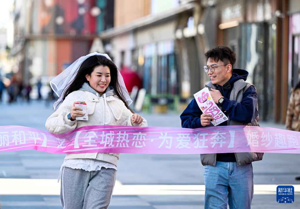当日,由天津市和平区民政局主办的“悦动津城·美丽和平” 之 “全城热恋·为爱狂奔”婚纱趣跑嘉年华活动在和平区金街步行街举行,吸引了数十对情侣参加。