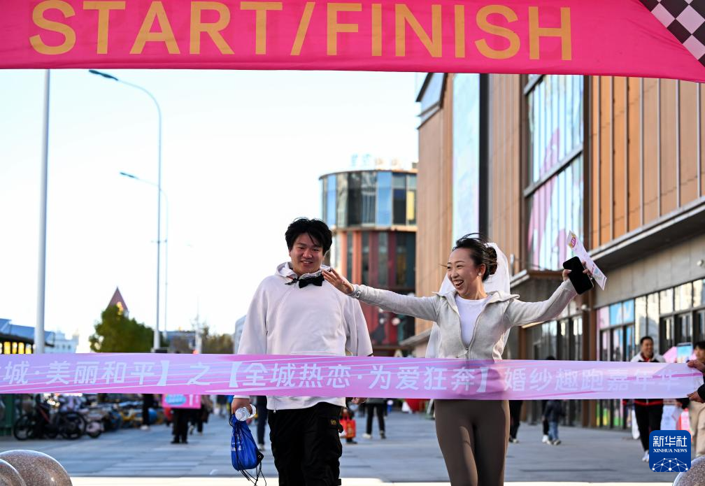 11月2日,参加活动的一对情侣在婚纱趣跑比赛中。
