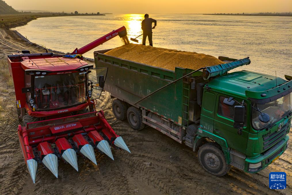 11月2日,在河南省三门峡市灵宝西阎乡黄河岸边,收割机把抢收的玉米装车(无人机照片)。