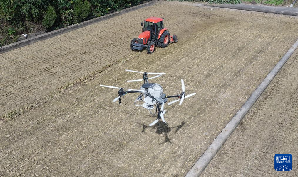 11月3日,植保无人机在位于江苏扬州的江苏里下河地区农科所(扬州市农科院)进行播种冬小麦前的施肥作业(无人机照片)。