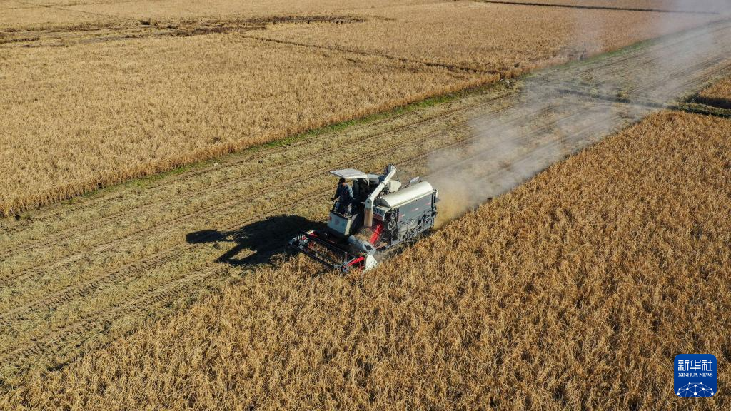 11月3日,在安徽省合肥市蜀山区小庙镇段冲村,农机手驾驶收割机在田间收割水稻(无人机照片)。