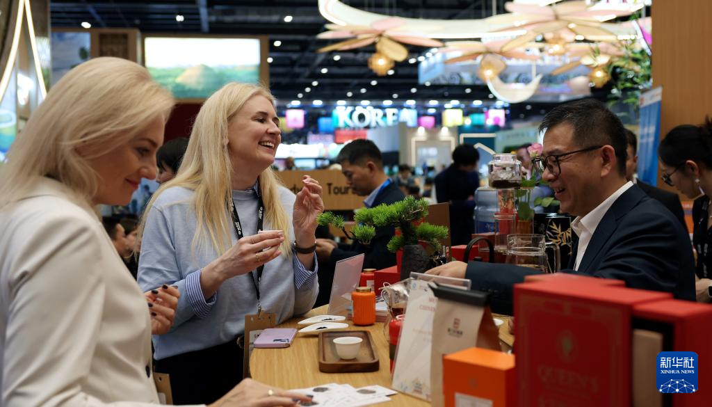 11月4日,两名女子在2025伦敦世界旅游交易会中国展区品尝中国茶。