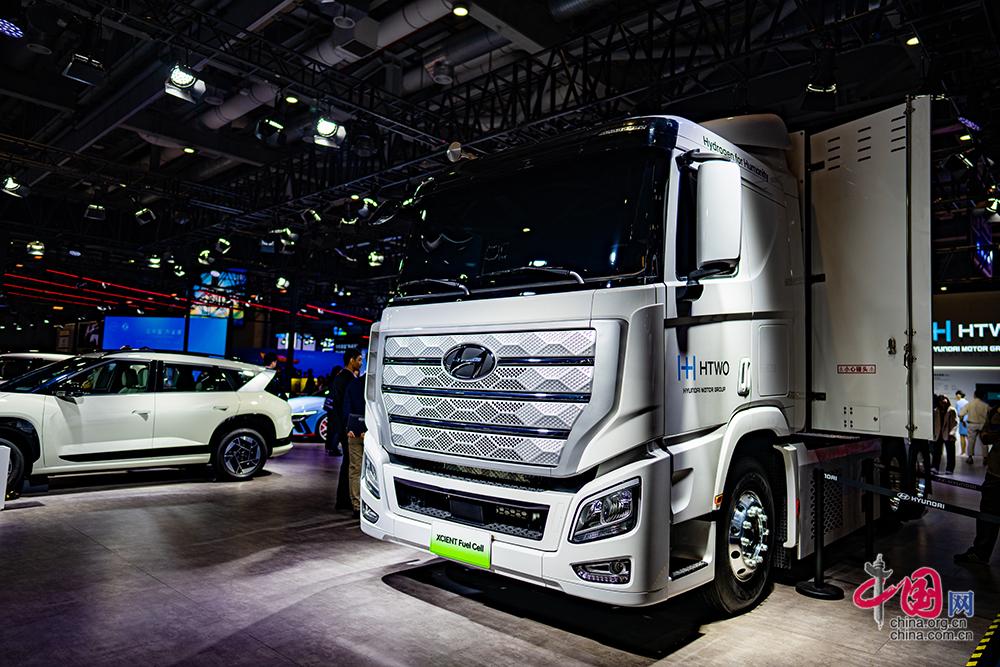 现代汽车带来的氢燃料电池8级重型卡车是全球首款量产氢动力重卡。中国网记者 郑亮摄