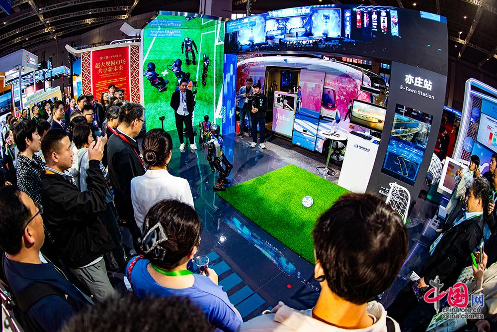 观众在进博会中国馆内观看机器人足球表演。中国网记者 郑亮摄