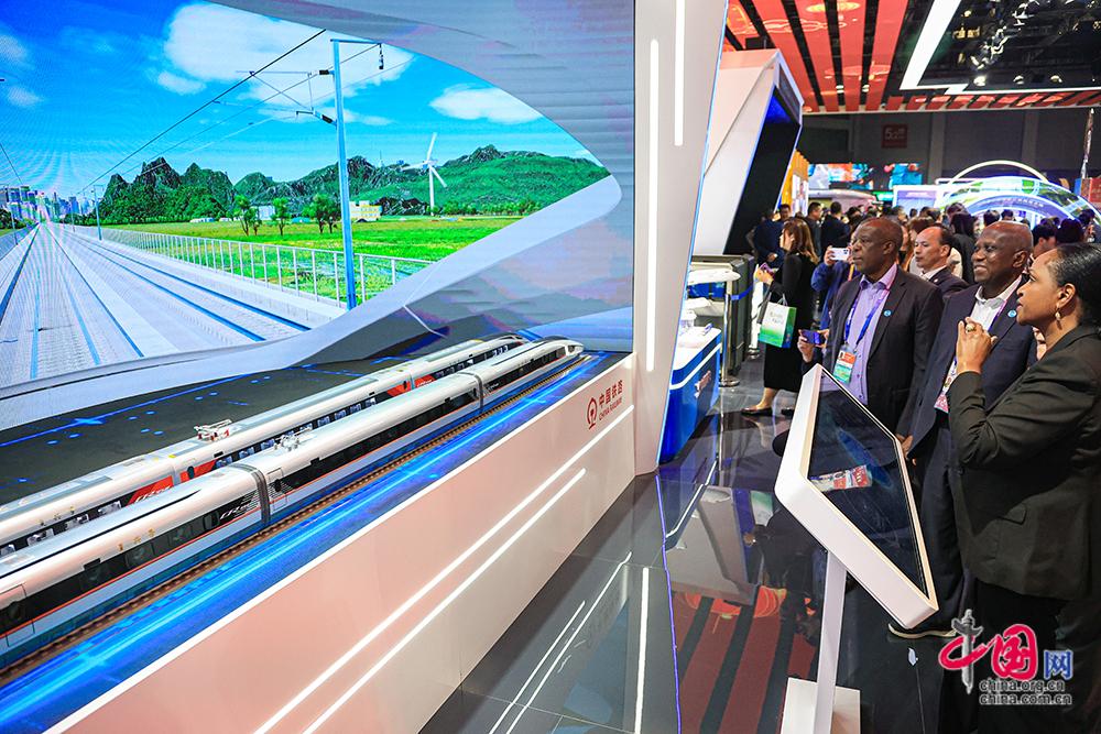 第八届中国国际进口博览会中国馆内展示的行驶在“一带一路”国家的中国研制生产的列车模型。中国网记者 郑亮摄