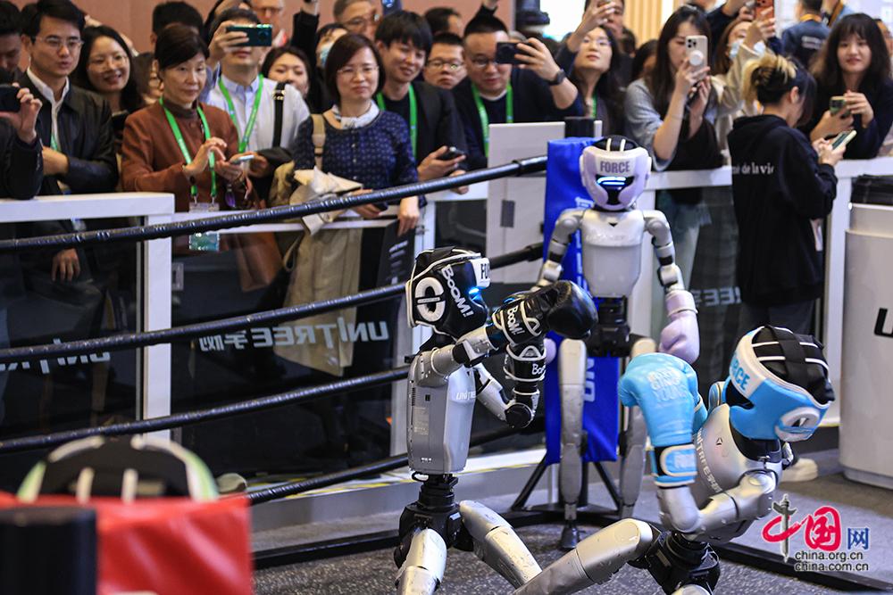 11月6日,在第八届进博会技术装备展区宇树科技展台,G1人形机器人的格斗表演吸引了众多观众。本届进博会,宇树科技带来了人形机器人G1,机器狗Go2、B2,以及最新发布的人形机器人R1、H2以及机器狗A2,可谓是“全家出动。中国网记者 伦晓璇 摄