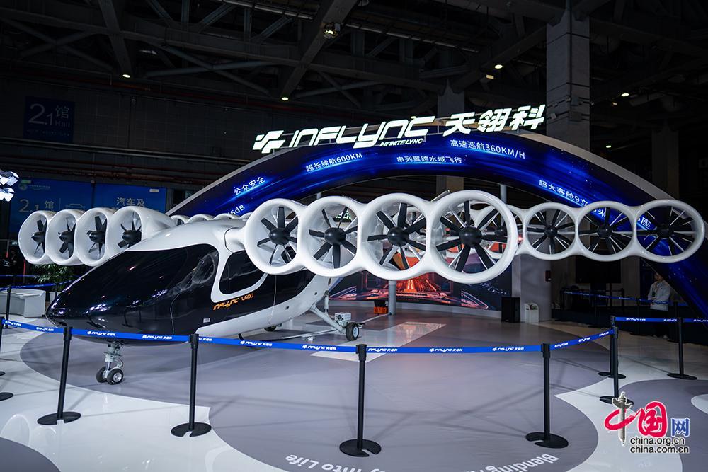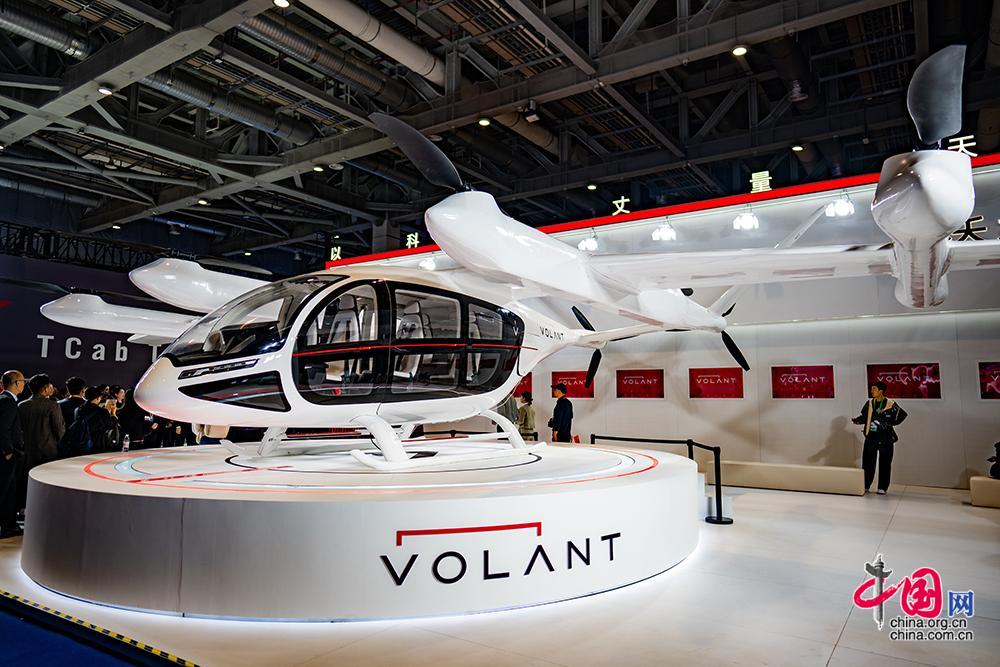 在进博会汽车及智慧出行展区沃兰特展位展示的一款复合翼电动垂直起降飞行器。中国网记者 郑亮摄