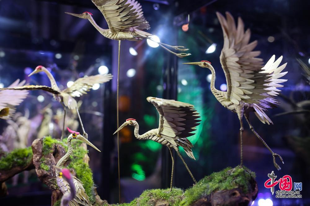 特色工艺展区内,非遗棕编作品《鹤翔九皋》格外抢眼,作品由不同色差的干棕叶精心编织而成。中国网记者 董宁 摄影