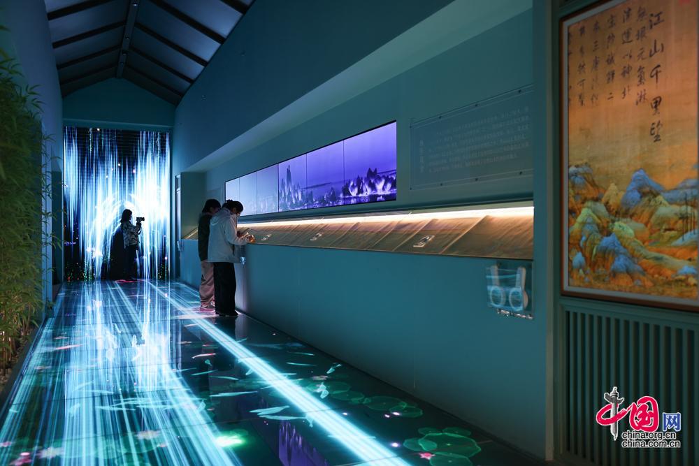 11月11日晚,“马栏山新媒体之夜”活动在长沙七彩盒子芒果未来艺术中心举办,现场图为记者在《千里江山图》动态光影空间体验。中国网记者 董宁 摄影